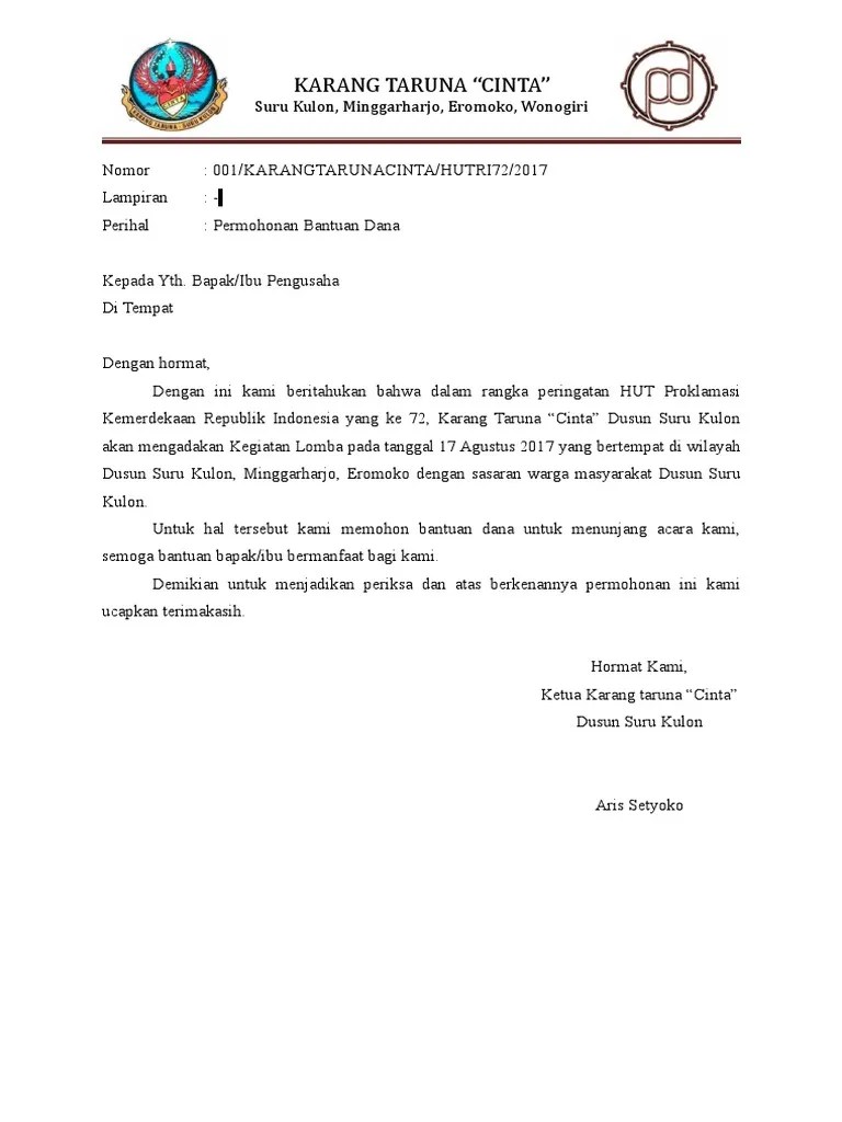 Di dalam surat permohonan ini berfungsi untuk menyampaikan suatu informasi berkaitan dengan masalah yang sedang dihadapi si penulis surat entah itu soal dana, kekukarangan tenaga, kebutuhan beasiswa, permintaan penguji … Pada intinya, isi dari surat pengajuan dana hanyalah berisikan besar dana yang diajukan, dan juga tujuan keperluan dari dana tersebut. Jan 21, 2013 · untuk mengajukan permohonan bantuan secara resmi kepada perorangan, lembaga, organisasi ataupun instansi swasta dan pemerintahan dibutuhkan contoh surat permohonan bantuan dana ini. Dengan dibuat surat permohonan tersebut, diharapkan donatur memberikan sejumlah dana yang dikolektifkan oleh panitia agar pembangunan tersebut bisa … Menulis surat pengajuan dana bukanlah hal yang susah.